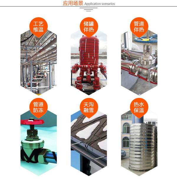 油田井口保温专用36伏电热带(又称:自控温电热带,自调控伴热电缆)广泛应用于石油井口伴热保温、抗凝、防冻。该电缆适用于油田管道伴热的普通区、危险区和腐蚀区,其介质维持温度范围为0~65℃。