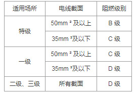● 低烟无卤电线电缆成束敷设时,应采用阻燃电线电缆,阻燃级别选择应符合下表,在外部火势作用下,需保持线路完整性,维持通电的场所,其线路应采用耐火电线电缆。