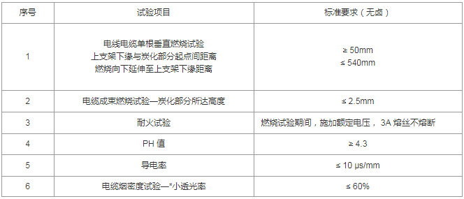 3 、电缆电线燃烧时具有低烟、无卤、阻燃和耐火性能,具体指标如下表。