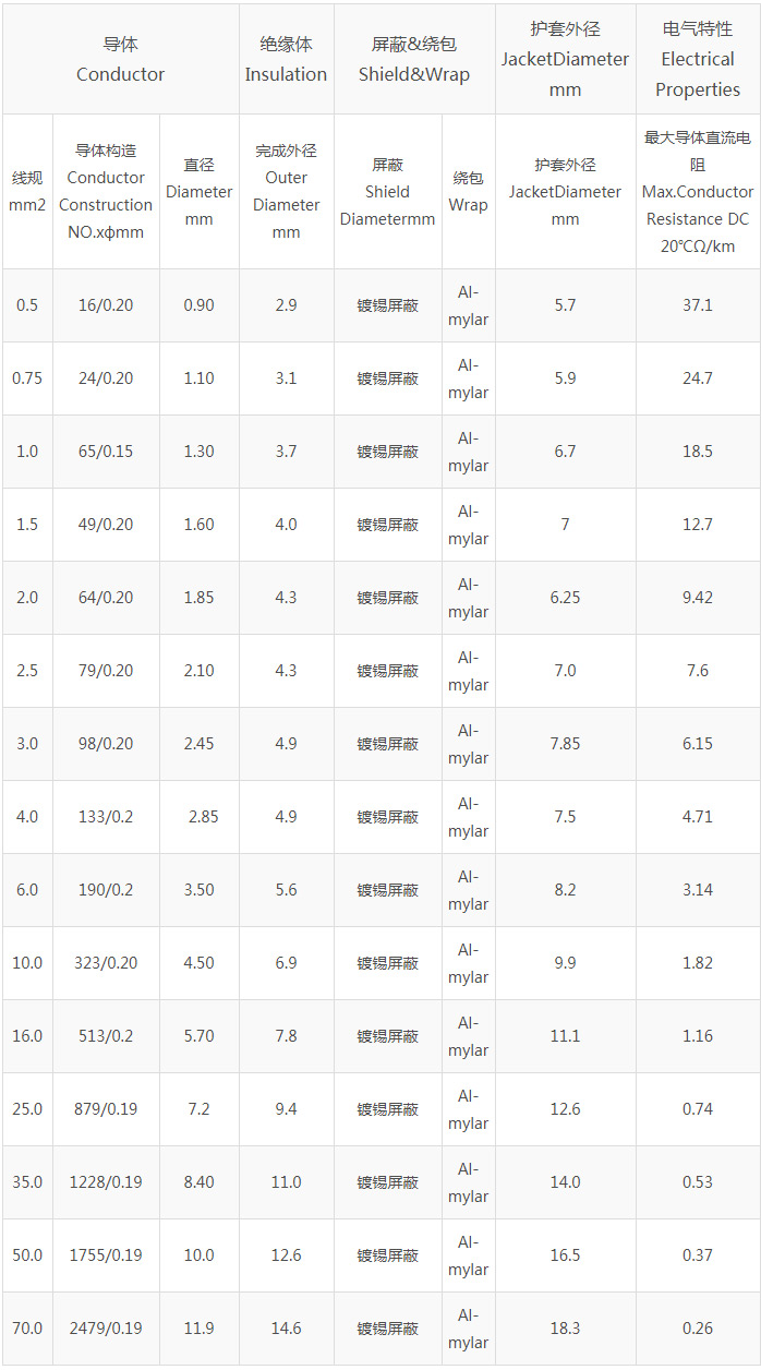 绝缘(TPE/交联聚烯烃)护套(交联聚烯烃)额定电压1500V ,火花电压高大10KV弯曲半径250D,便于安装电缆单根阻燃满足VW-1绝缘材料满足UL94-V0不含卤素,环保型电缆屏蔽密度290%,具有良好的抗电磁干扰能力参考标准(ISO6722;GB/T25085;GB/T2591;QC/T 1037)详细尺寸以产品规格书为准
